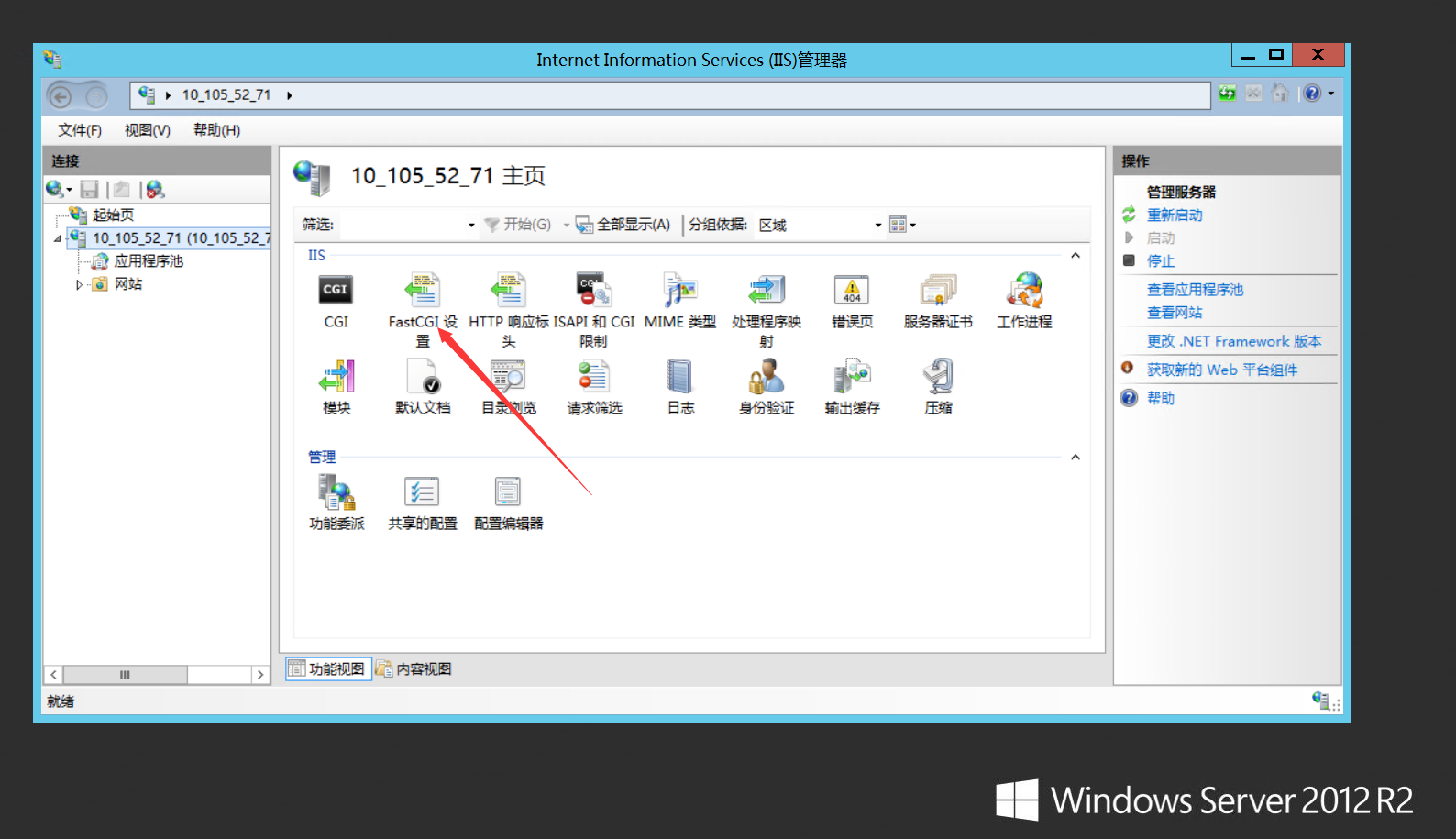 注:有些小伙伴可能找不到“FastCgiModule”板块,那是因为没有安装CGI,只需要在“添加角色和功能向导”中选中CGI并安装就可以了