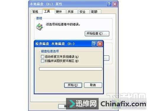 当检测是逻辑坏道时,最简单的方法我们可以尝试用Windows自带的磁盘工具。进入“我的电脑”中选择有逻辑坏道的硬盘,单击鼠标右键,选择“属性”→“工具”→“开始检查”就弹出“磁盘扫描程序”,选中“完全”并将“自动修复错误”打上勾,单击“开始”,就开始对该分区进行扫描和修复。