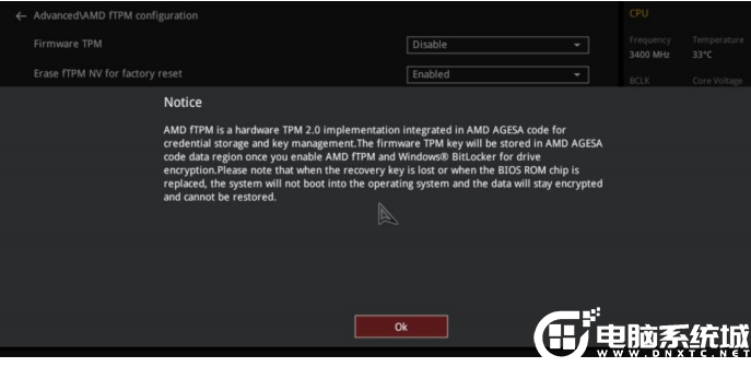 我们选择enabled开启tpm后,回车后我们选择开启,会提示一个 警告信息,我们只需要点击OK就可以开启tpm功能,开启后我们按F10进行BIOS保存,如下图所示;