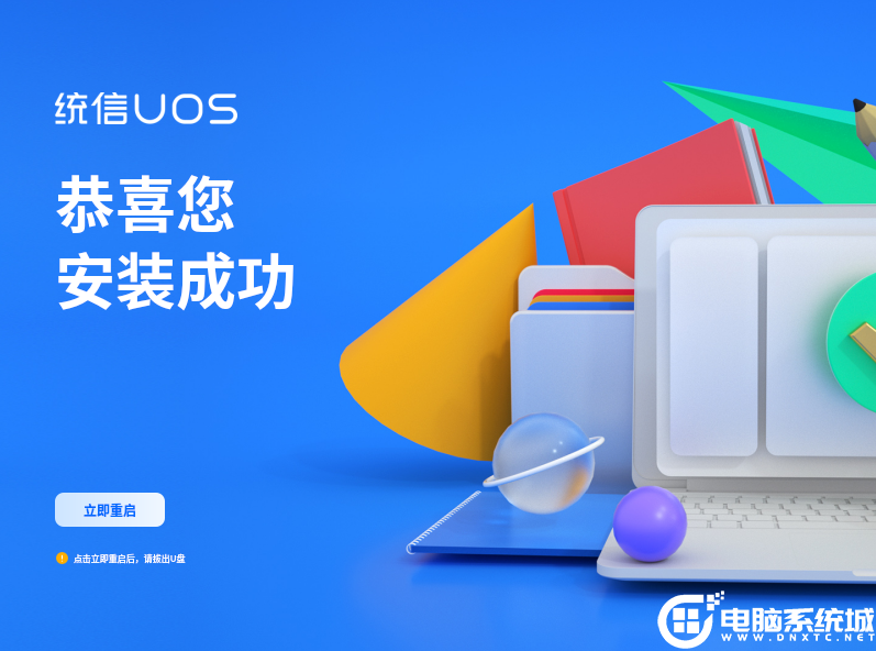 12,安装完成,提示重启,重启后拨掉u盘,如下图所示;